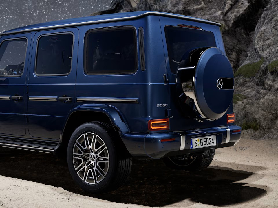 Ngoại thất G 500 giữ nguyên phong cách “boxy” huyền thoại: kích thước ~4.87 x 1.93 x 1.97 m, góc thoát trước/sau 31°/30°, khả năng lội nước 70 cm – “ông vua địa hình” đích thực. Lưới tản nhiệt lớn, đèn LED Multibeam tự thích ứng, la-zăng 20″ AMG (tùy chọn 22″) lấp lánh – mọi góc nhìn đều toát lên vẻ quyền lực và thanh lịch đặc trưng của ngôi sao ba cánh.
