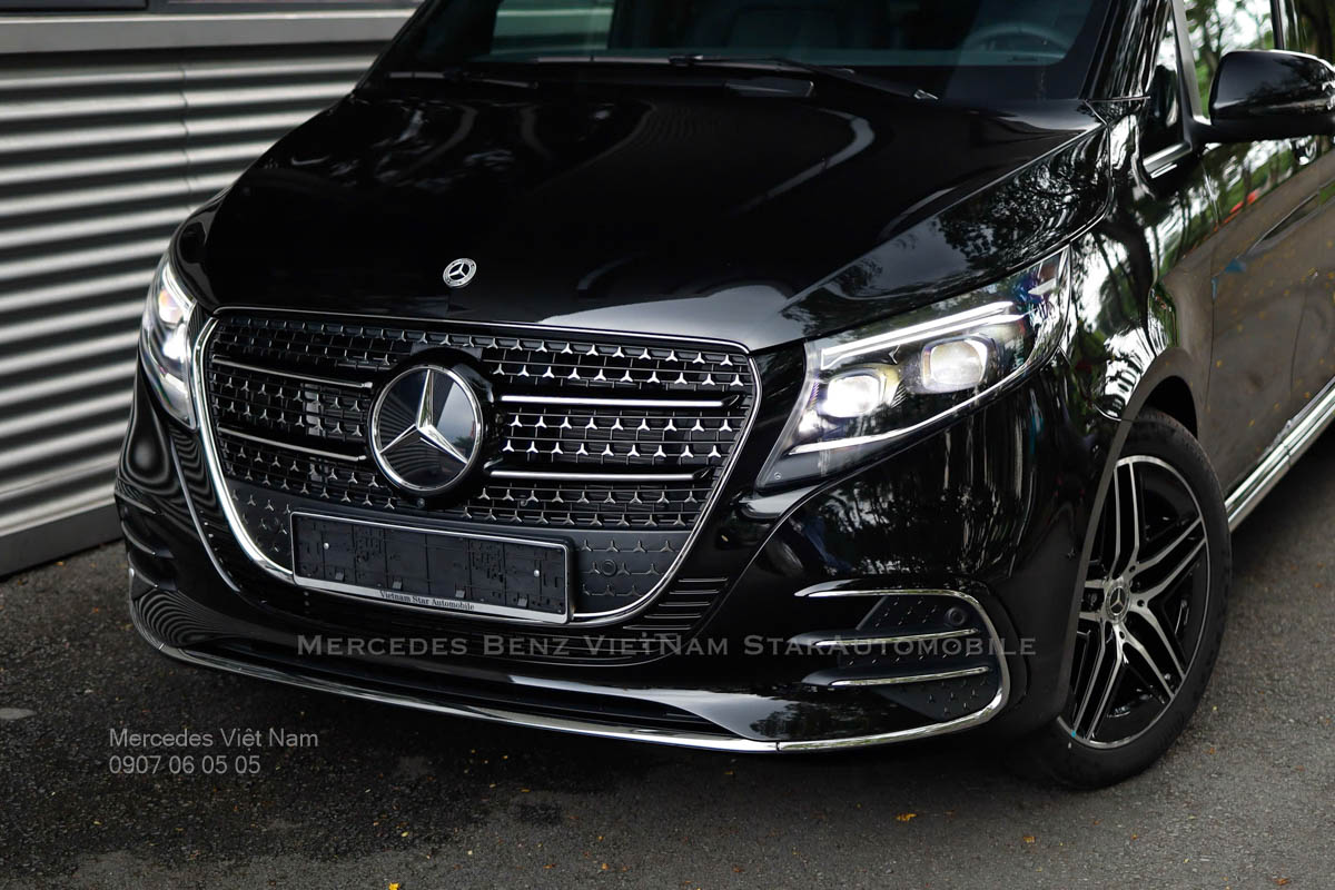 Mercedes V300 AMG toát lên vẻ ngoài mạnh mẽ, quyền lực nhưng vẫn giữ được sự tinh tế đặc trưng của thương hiệu Mercedes-Benz, khiến nó trở thành lựa chọn hàng đầu cho các doanh nhân Việt Nam. Với gói AMG Line lưới tản nhiệt gồm nhiều logo Mercedes nhỏ sang trọng kết hợp logo ngôi sao ba cánh lớn đặt ở trung tâm tạo cảm giác hầm hố, chiếc xe như một tuyên ngôn về sự thành công, nổi bật giữa dòng xe cộ đô thị. Cụm đèn pha MULTIBEAM LED thông minh, với khả năng điều chỉnh tự động theo điều kiện đường, không chỉ mang lại tầm nhìn rõ nét mà còn tạo hiệu ứng ánh sáng cuốn hút khi di chuyển ban đêm trên những con đường như Lê Duẩn ở Hà Nội hay Nguyễn Huệ ở Sài Gòn.